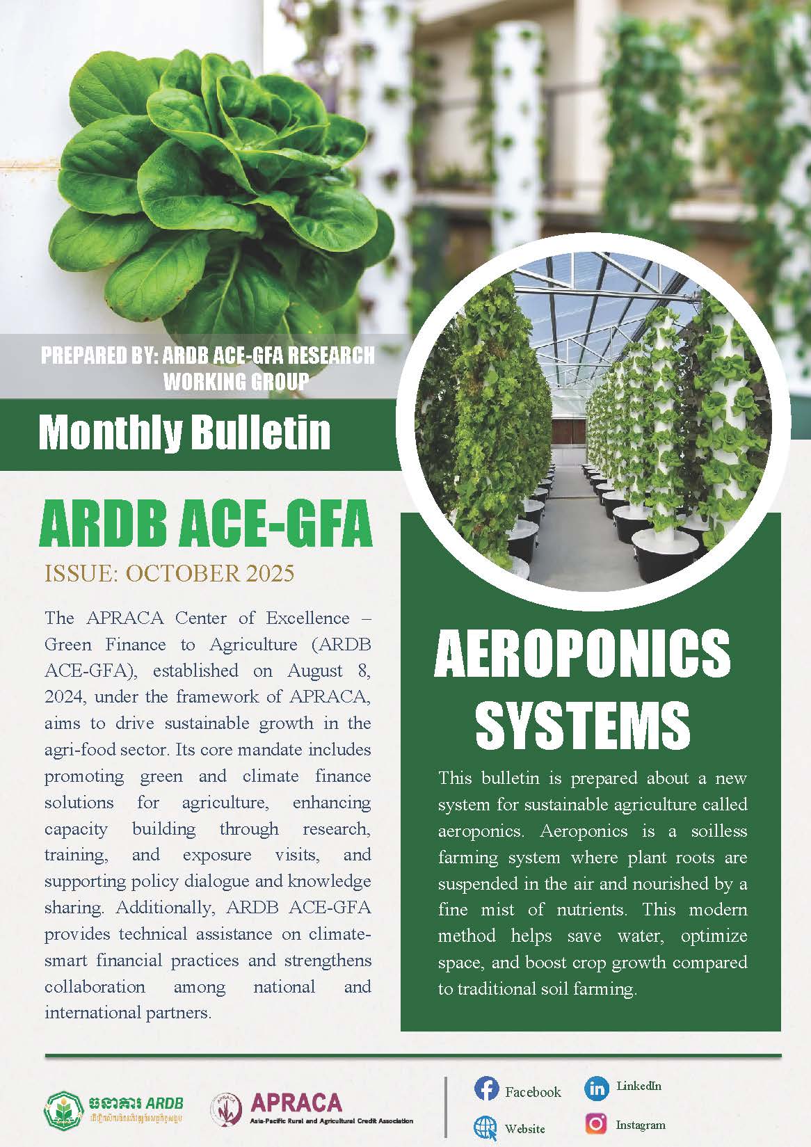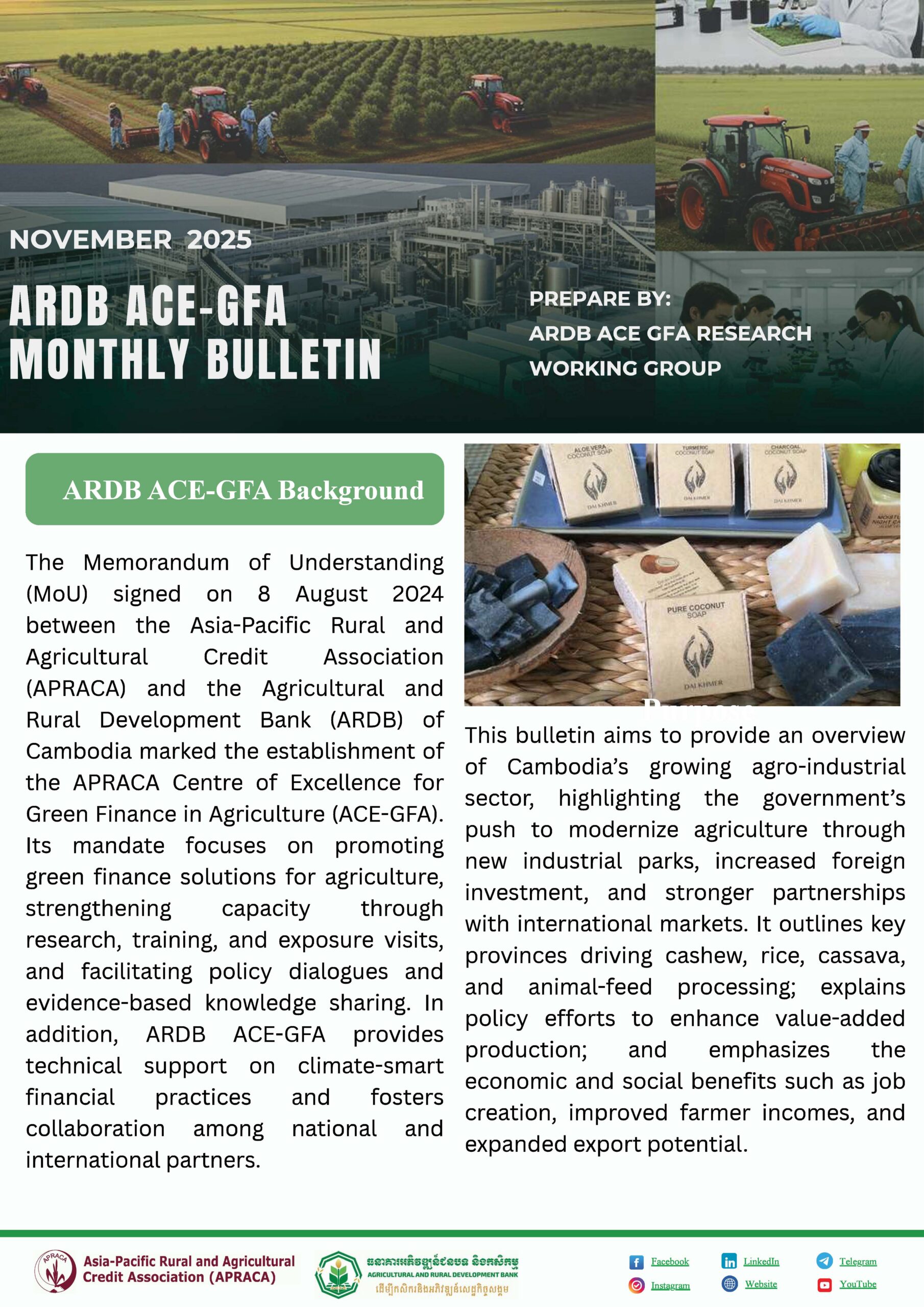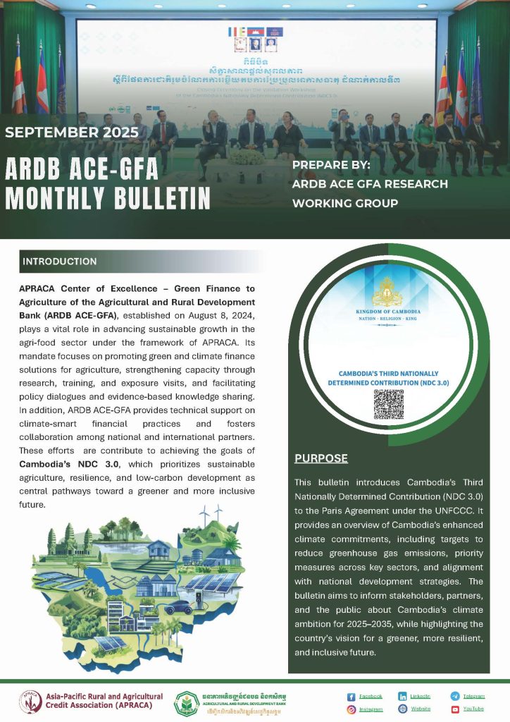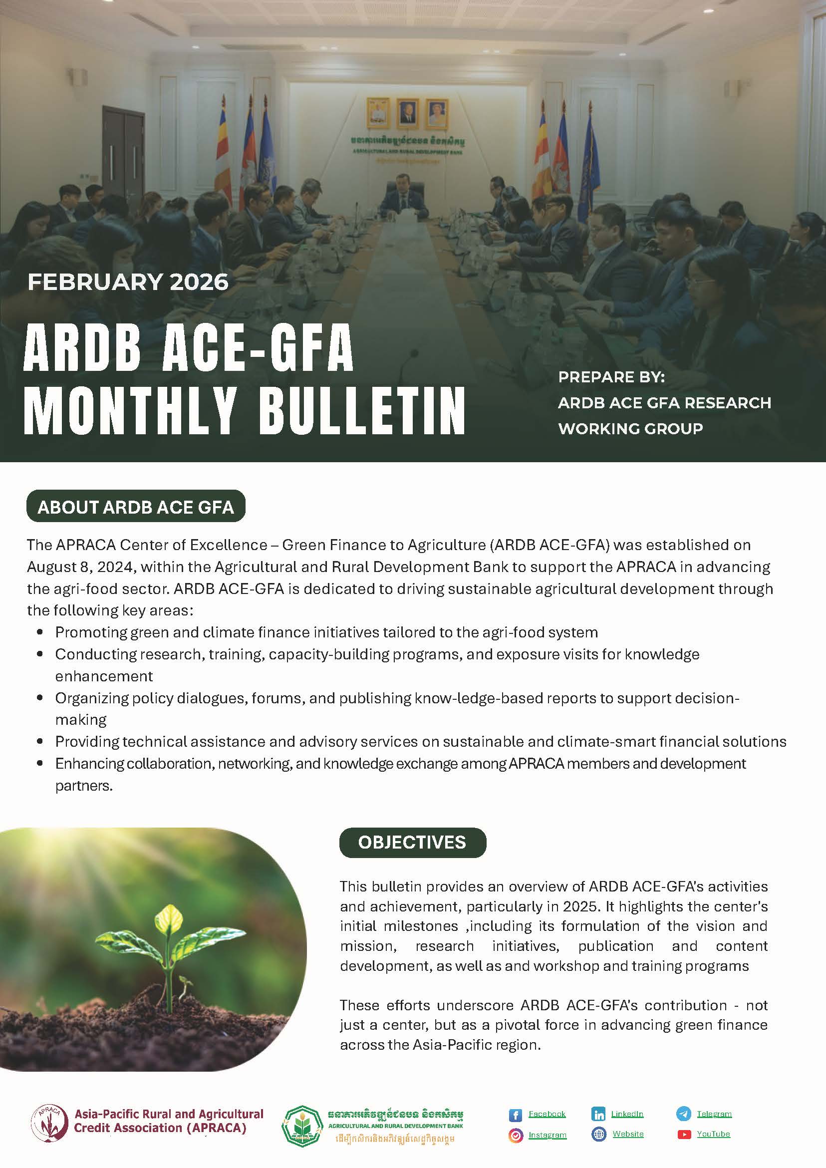 The bulletin highlights the adoption of Cambodia’s “Operations Manual for Article 6,” a critical framework for authorizing and transferring carbon credits internationally. It outlines strategies to strengthen government leadership, expand market demand, and build domestic capacity, emphasizing nature-based solutions, standardized baselines, and integration of UN SDGs to enhance project value. Through this publication, ARDB ACE-GFA reaffirms its commitment to promoting green finance and supporting Cambodia’s transition toward a low-carbon, climate-resilient economy aligned with its NDC targets.