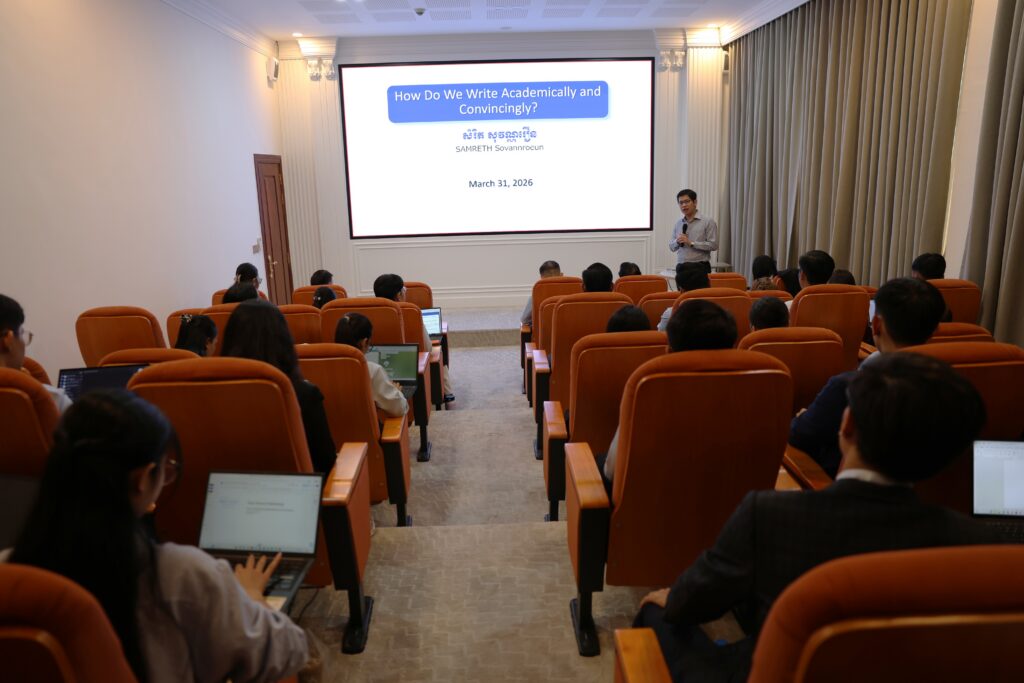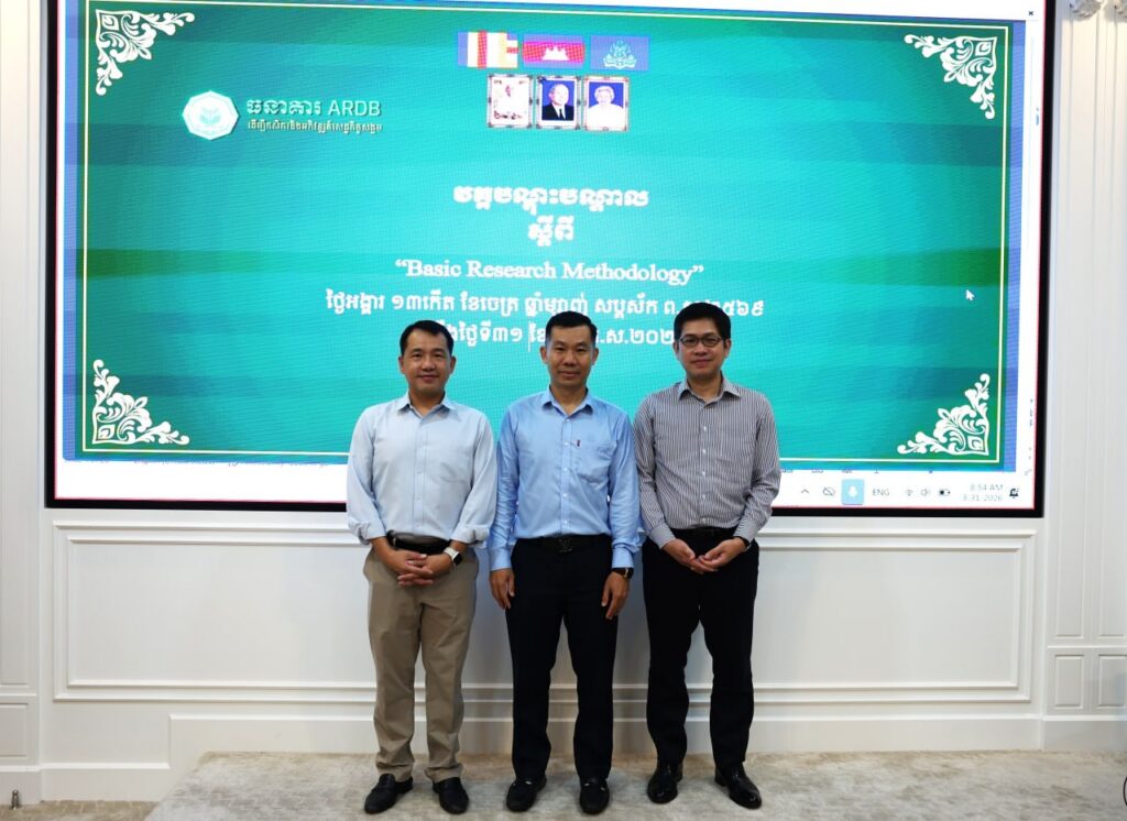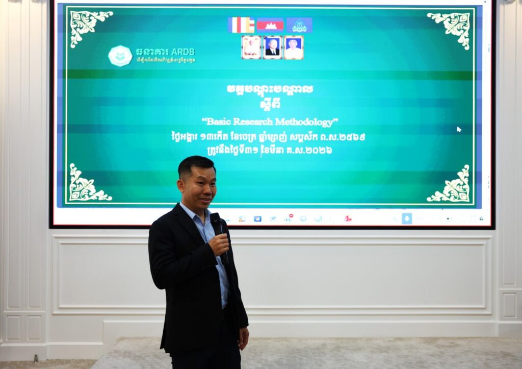 Phnom Penh: With the approval of H.E. Dr. Kao Thach, Delegate of the Royal Government in charge as CEO of the Agricultural and Rural Development Bank (ARDB), the ARDB Research Working Group, in collaboration with the Professional Training Division of the Research and Development Department, organized and coordinated a training on “Basic Research Methodology.” delivered by Dr. Samreth Sovanroeun, Vice Chairman of the APM Board of Directors, and Dr. Ngov Penghuy, Member of the APM Board of Directors. The training brought together a total of 88 participants (42 participants attending in person and 46 participants attending online). The training program will be held over one and a half days, from March 31 to May 1, 2026.